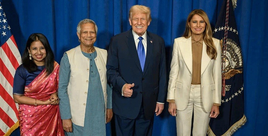 মার্কিন প্রেসিডেন্ট ডোনাল্ড ট্রাম্প এবং ফার্স্টলেডি মিলেনিয়া ট্রাম্পের সঙ্গে প্রধান উপদেষ্টা অধ্যাপক মুহাম্মদ ইউনূস ও তার মেয়ে দিনা ইউনূসের ছবি প্রকাশ করেছে প্রেস উইং। গত ২৩ সেপ্টেম্বর লোটে নিউইয়র্ক প্যালেসে ট্রাম্পের অভ্যর্থনা নৈশভোজে এই ছবি তোলা হয়।