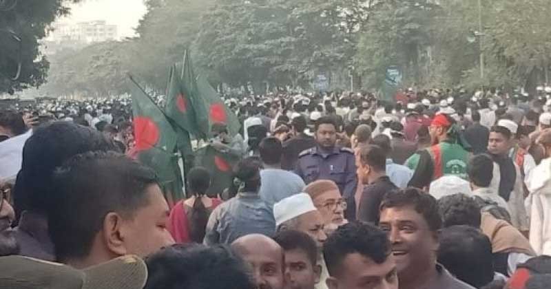 ইনকিলাব মঞ্চের মুখপাত্র শহীদ শরিফ ওসমান হাদির জানাজা ঘিরে সংসদ ভবন এলাকায় মানুষের ঢল নেমেছে। শনিবার সকাল থেকেই দেশের বিভিন্ন প্রান্ত থেকে দলে দলে মানুষ সেখানে এসে জড়ো হন। বেলা সাড়ে ১১টা বাজার আগেই পুরো মানিক মিয়া অ্যাভিনিউ কানায় কানায় পূর্ণ হয়ে যায়। এ সময় তারা ‘আমরা সবাই হাদি হবো, যুগে যুগে লড়ে যাব’, ‘হাদি ভাইয়ের রক্ত বৃথা যেতে দেব না’ ইত্যাদি স্লোগান দেন। সবার কণ্ঠে একই আওয়াজ- হাদি হত্যার বিচার চাই।