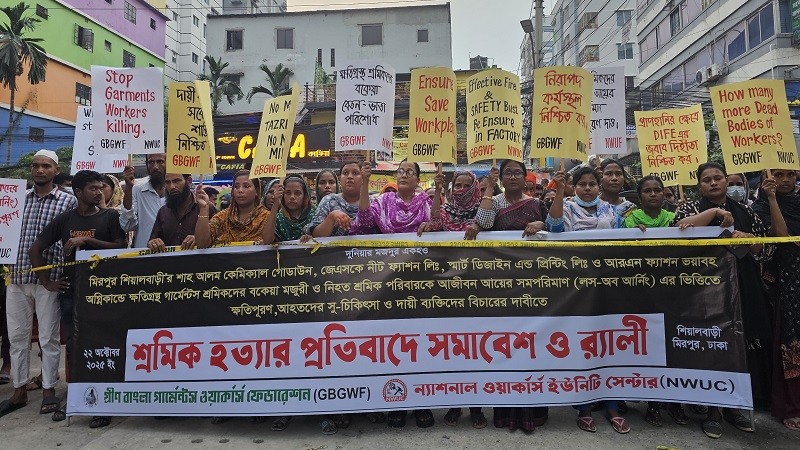 বক্তারা বলেন ঢাকার মিরপুরে সাম্প্রতিক আগুনের ঘটনায় শ্রমিকের মৃত্যু কাঠামোগত হত্যাকান্ড। আগুন দ্রুত ছড়িয়ে পড়ার পেছনে মূল কারণগুলো স্পষ্ট-নিরাপত্তাহীন ভবন, অবৈধভাবে রাখা রাসায়নিক গুদাম, এবং অকার্যকর অগ্নিনির্বাপণ ব্যবস্থা। অগ্নিকান্ডের স্থানের কারখানা ভবনগুলির ঘনত্ব এবং কাঠামো থেকে কোন ভবনকেই শিল্প কারখানা হিসাবে গণ্য করা যায় না। রাজধানী উন্নয়ন কর্তৃপক্ষ (রাজউক), কলকারখানা পরিদর্শন প্রতিষ্ঠান (ডাইফ) এবং সংশ্লিষ্ট এলাকার অগ্নিনির্বাপন সনদ প্রদানের দায়িত্বপালনকারী প্রতিষ্ঠানের দায়িত্ব প্রাপ্ত ব্যক্তিরা কেউই তাদের দায়িত্ব পালন করেনি। কারখানায় রাসায়নিক গুদামসহ বিভিন্ন ঝুঁকিপূর্ণ স্থাপনার কারণে অতীতেও বিপুল সংখ্যক হতাহতের ঘটনা ঘটেছে এবং সবসময়ই সবচেয়ে বেশি ক্ষতি গ্রস্থ হয়েছেন শ্রমিক ও নিম্ন আয়ের কর্মজীবীরা। এই হত্যাকান্ডের বিচার ও ন্যায্য ক্ষতিপূরণ দিতে হবে।