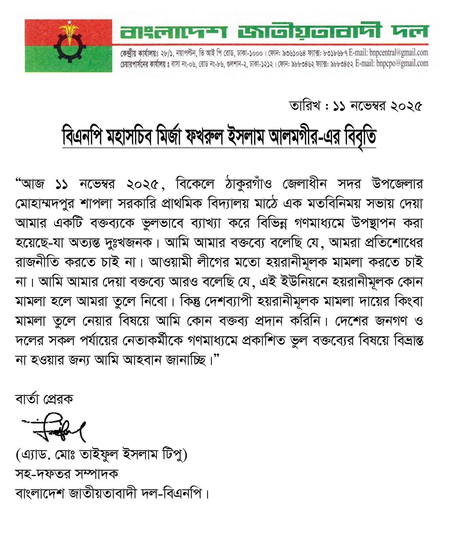 সংবাদ বিজ্ঞপ্তিতে মির্জা ফখরুল বলেন, 'বিকেলে ঠাকুরগাঁওয়ের সদর উপজেলার মোহাম্মদপুর শাপলা সরকারি প্রাথমিক বিদ্যালয় মাঠে এক মতবিনিময় সভায় দেয়া আমার একটি বক্তব্যকে ভুলভাবে ব্যাখ্যা করে বিভিন্ন গণমাধ্যমে উপস্থাপন করা হয়েছে, যা অত্যন্ত দুঃখজনক। আমি আমার বক্তব্যে বলেছি, আমরা প্রতিশোধের রাজনীতি করতে চাই না। আওয়ামী লীগের মতো হয়রানিমূলক মামলা করতে চাই না।