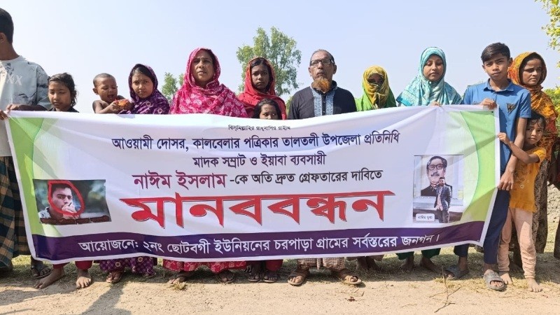 গতকাল শুক্রবার (৫ ডিসেম্বর) সকাল ১১টায় ২নং ছোটবগী ইউনিয়নের চরপাড়া গ্রামের সাধারণ মানুষের উদ্যোগে এ মানববন্ধন আয়োজন করা হয়। এতে স্থানীয় বিভিন্ন শ্রেণি–পেশার মানুষ অংশ নেন। মানববন্ধনে বক্তারা অভিযোগ করেন, নাঈম ইসলাম ‘দৈনিক কালবেলা’ পত্রিকার সাংবাদিক পরিচয় ব্যবহার করে এলাকায় প্রভাব খাটিয়ে দীর্ঘদিন ধরে ইয়াবা ব্যবসা ও সরবরাহ করে আসছিলেন। তার মাদক চক্রের কারণে এলাকার যুব সমাজ ধ্বংসের দ্বারপ্রান্তে পৌঁছে গেছে। তিনি বিভিন্ন সহজ-সরল যুবকদের প্রলোভন দেখিয়ে মাদক বেচাকেনায় ব্যবহার করতেন।